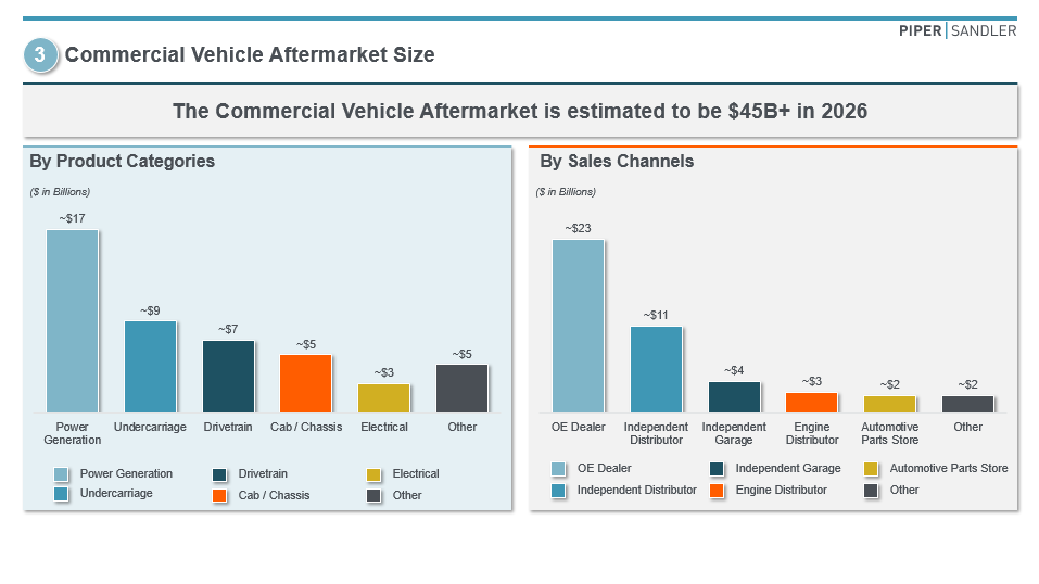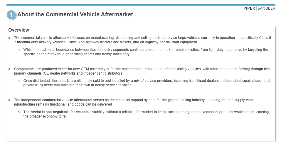 Component parts are manufactured for two primary purposes - to be assembled by an original equipment manufacturer (OEM), or to be used in the maintenance, repair or upfit of existing trucks in operation (aftermarket). These aftermarket parts are distributed through two primary channels - the original equipment dealer network and the independent distributor. The majority of these aftermarket parts are then sold to and installed by repair/service operations including dealers, independent repair facilities, or to truck fleets that may have their own repair and maintenance facilities.