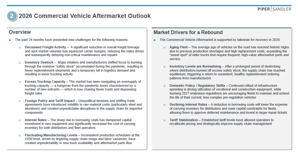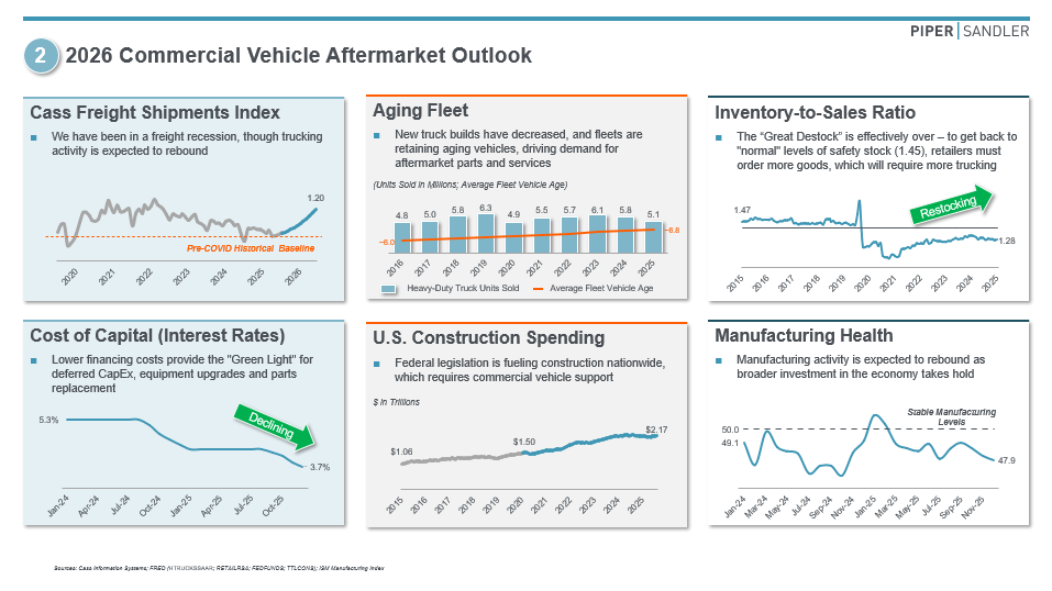 The independent commercial vehicle aftermarket supports the trucking industry, which is a primary and essential piece of the supply chain infrastructure around the world. Trucks deliver product and goods everywhere - without trucks, the economy fails.